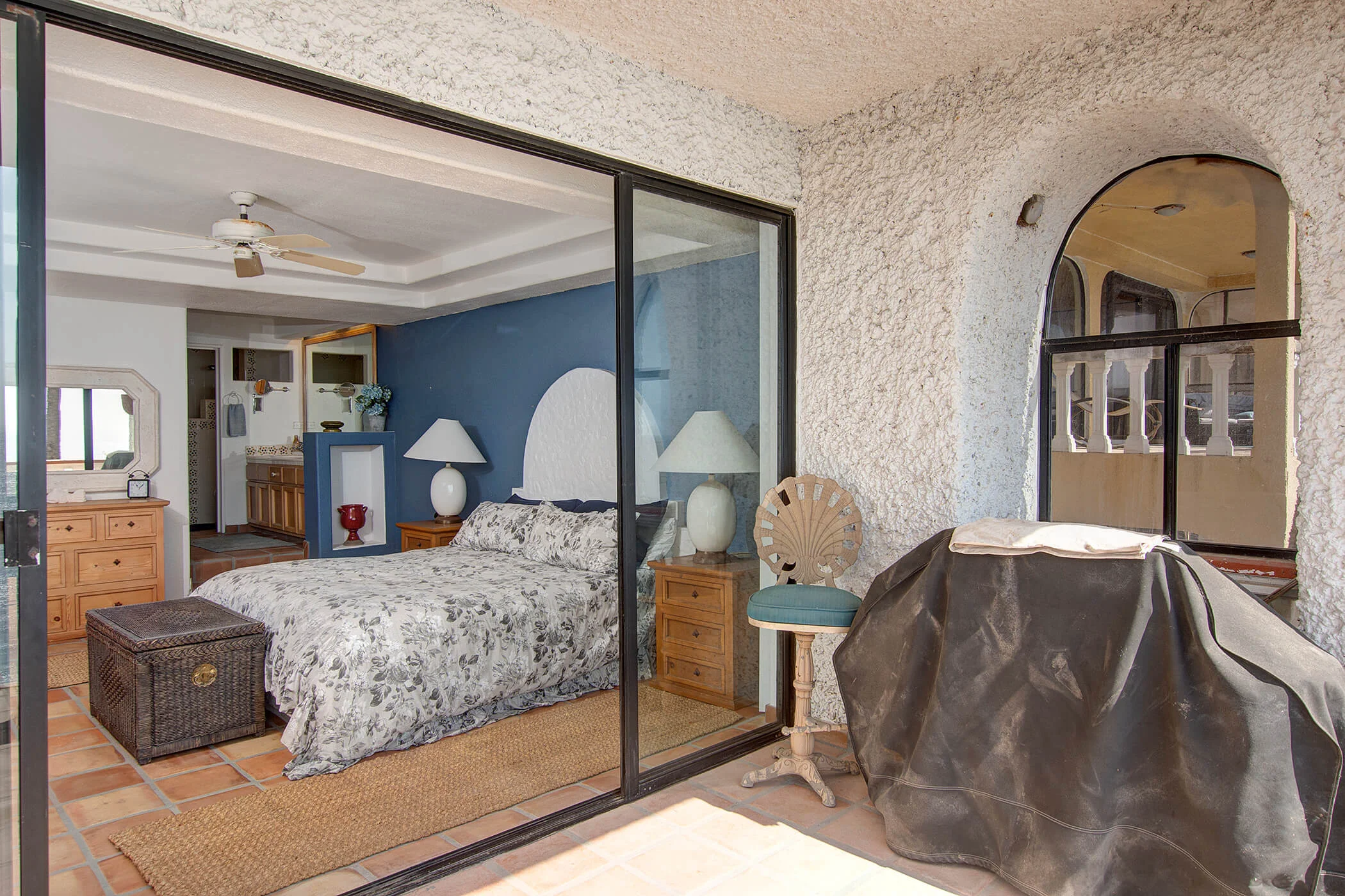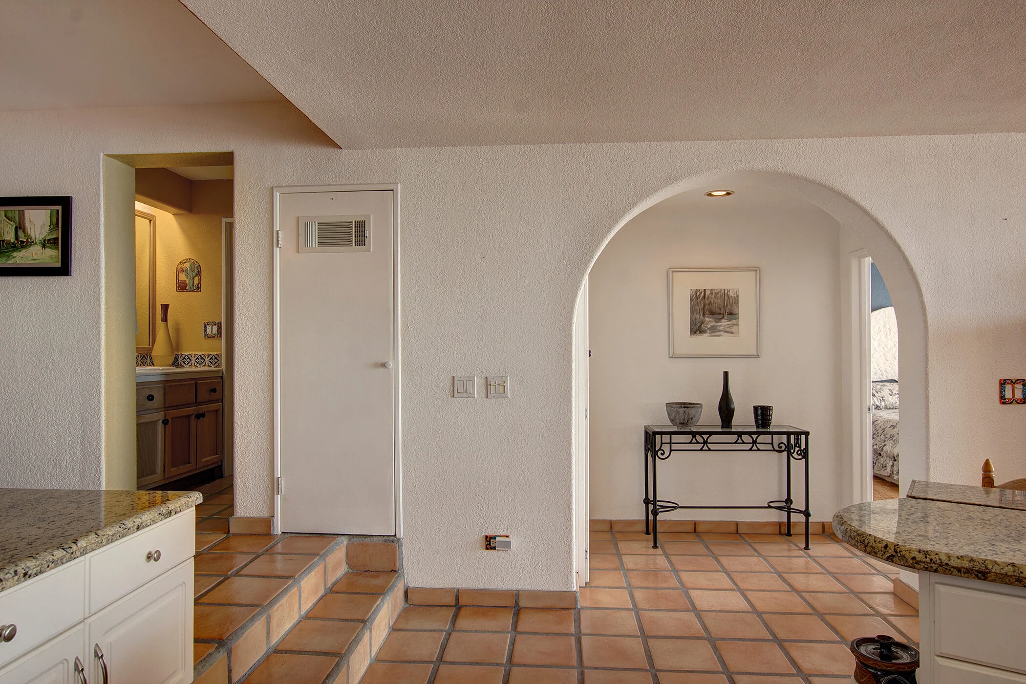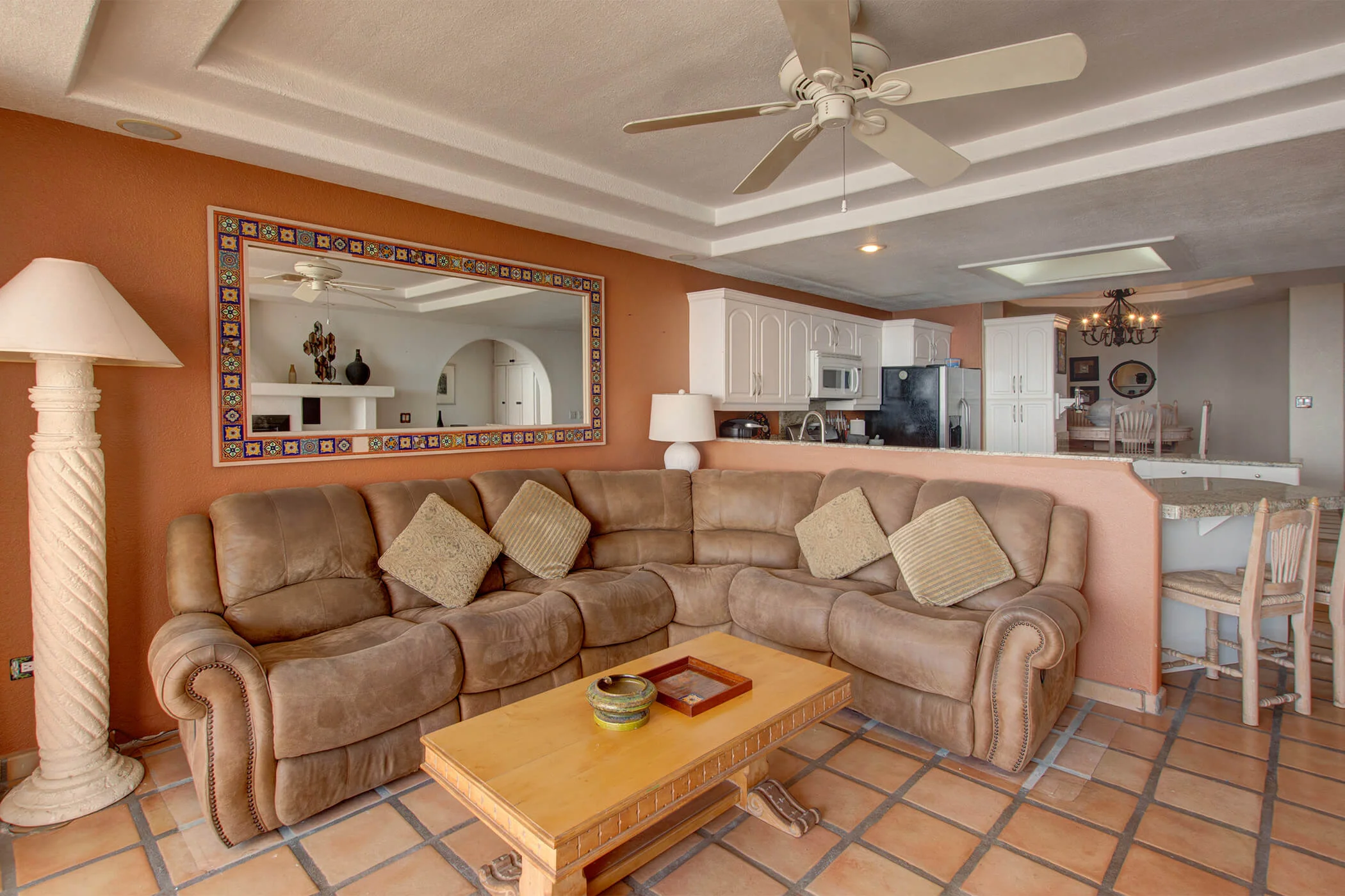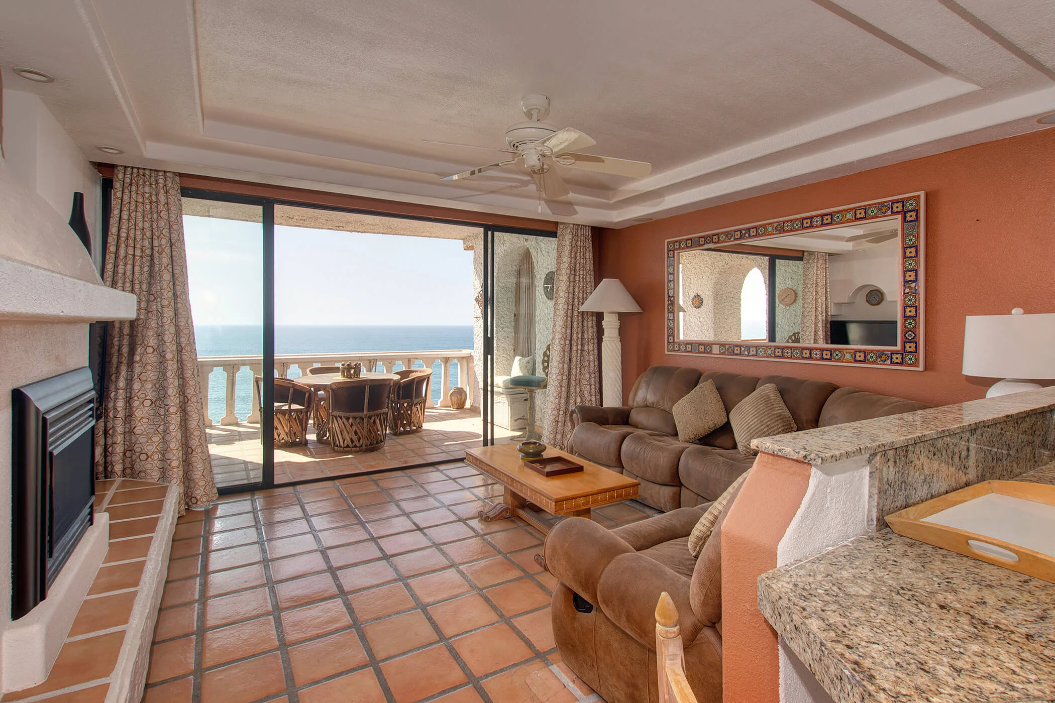 Just inside the patio is the living area, with tall, wide patio sliders to take in the views. There is a fireplace, a built-in entertainment system with shelves for decorative pieces, a ceiling fan, lovely Saltillo tile, and included furniture.