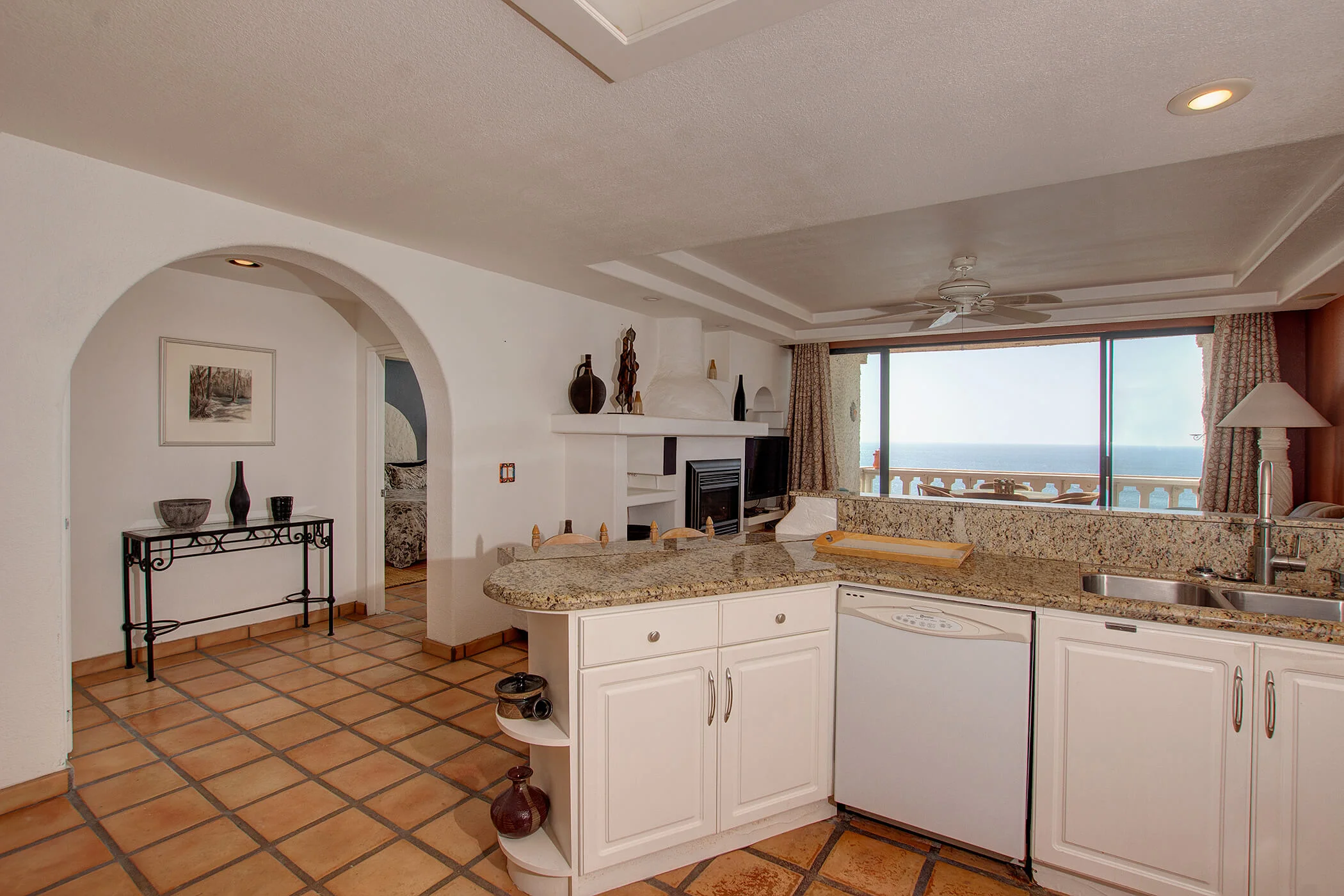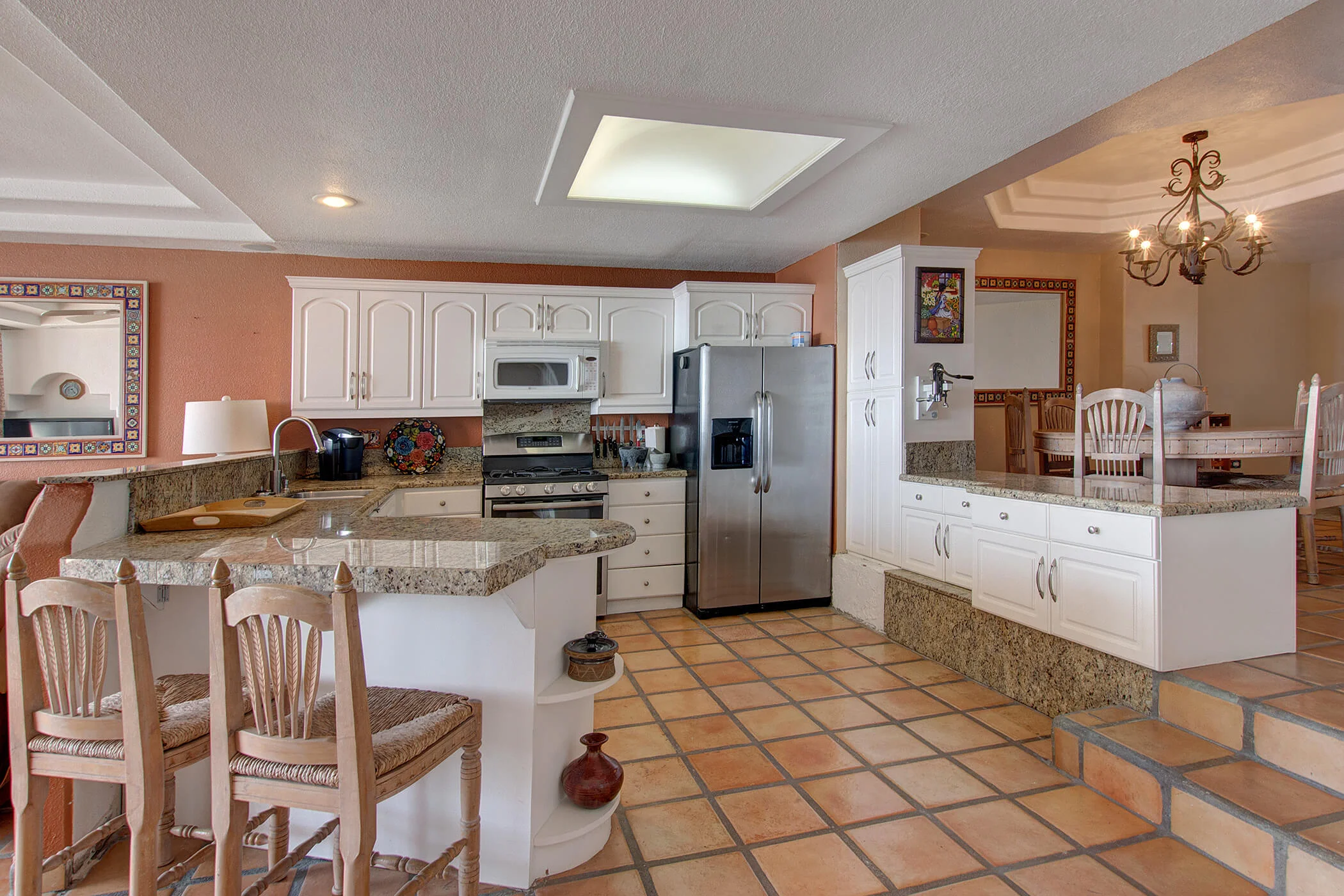 The kitchen is also oriented toward the ocean views. Enjoy a sunset as you prepare tapas, squeeze limes, or salt glasses. There is a stainless-steel gas stove with a double oven and a refrigerator. Enjoy the bar seating, granite countertop, modern cabinets with ample storage, and dishwasher.