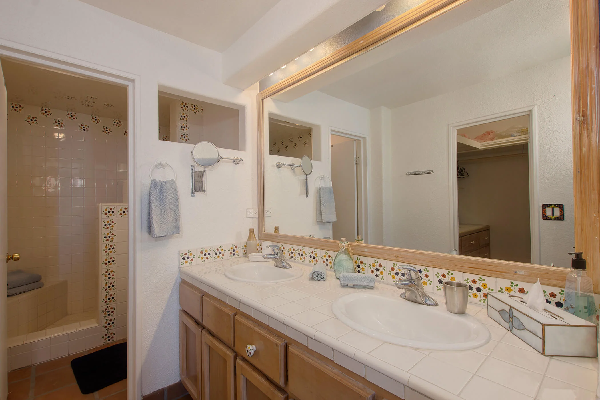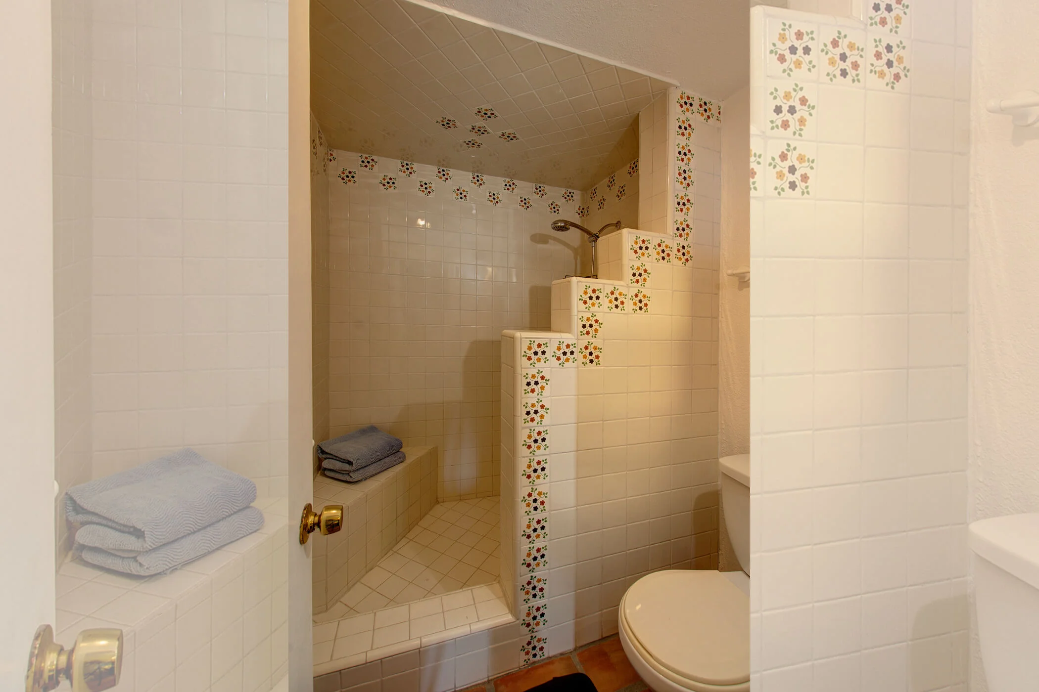 The bathroom features Mexican tile, cabinet pulls, indirect lighting, and a large full-length vanity mirror. The step-in shower has matching Mexican tile and a tiled seat.