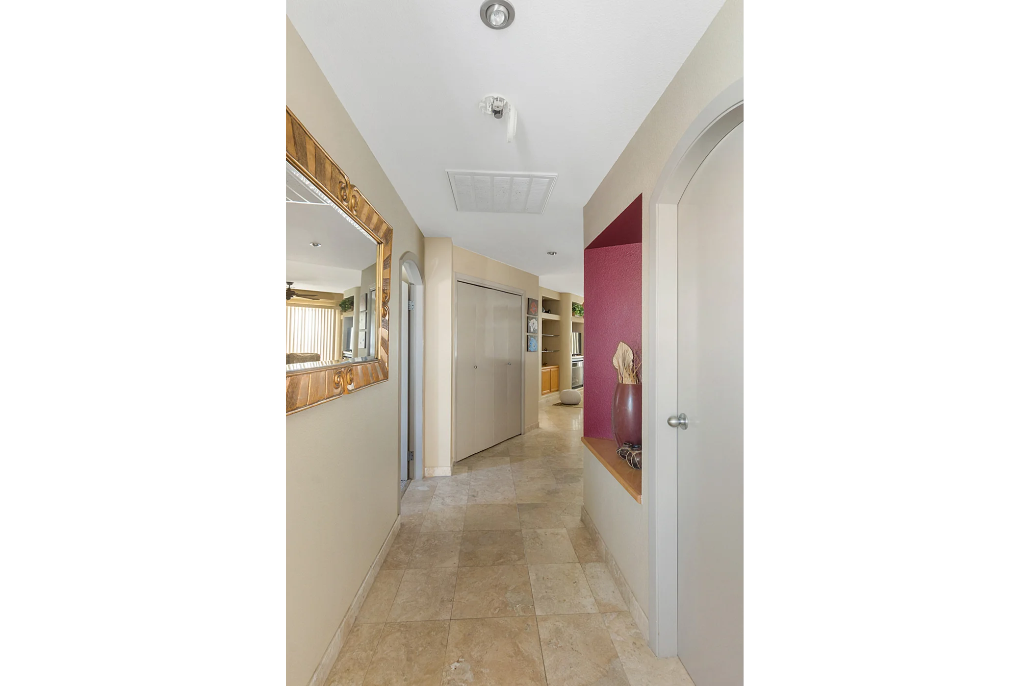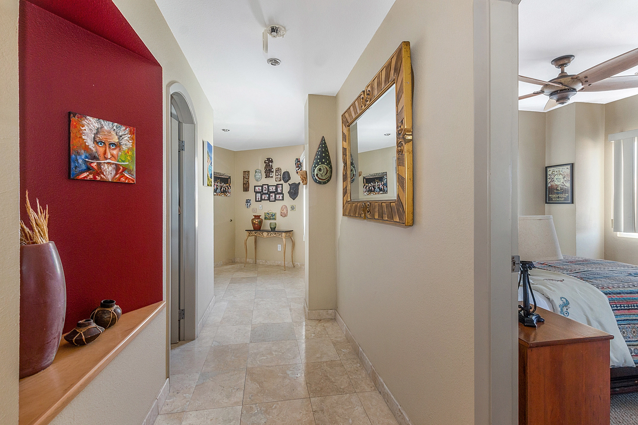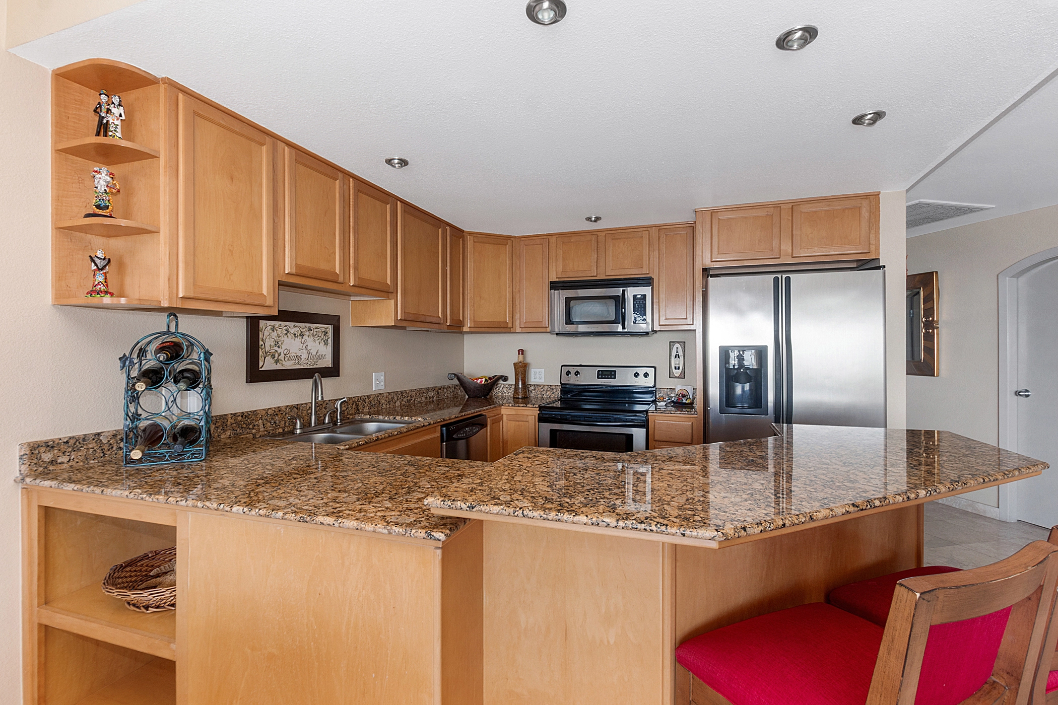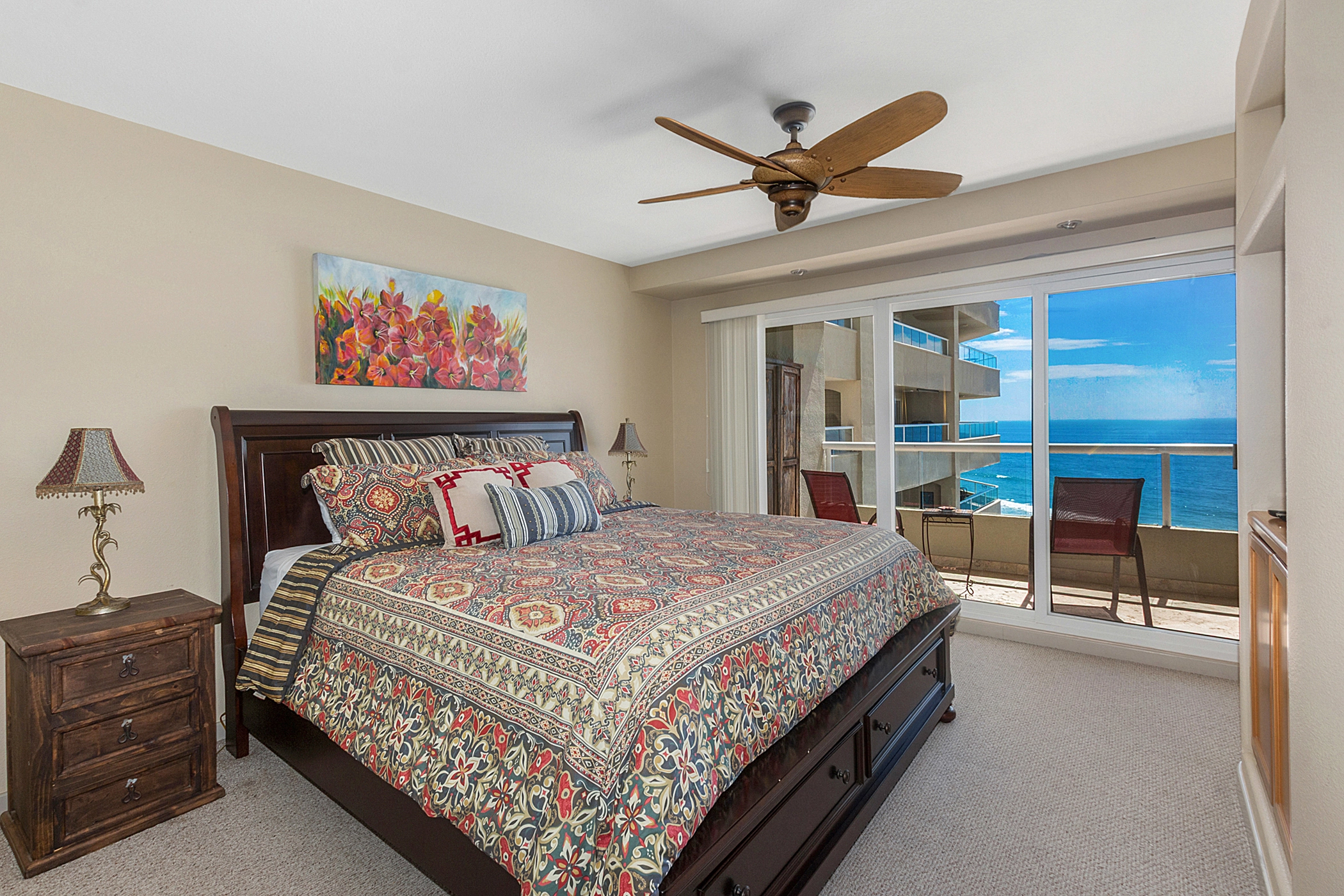 This fully furnished and equipped condo features premium upgrades, including travertine tile flooring throughout and unique hand-painted art accents.