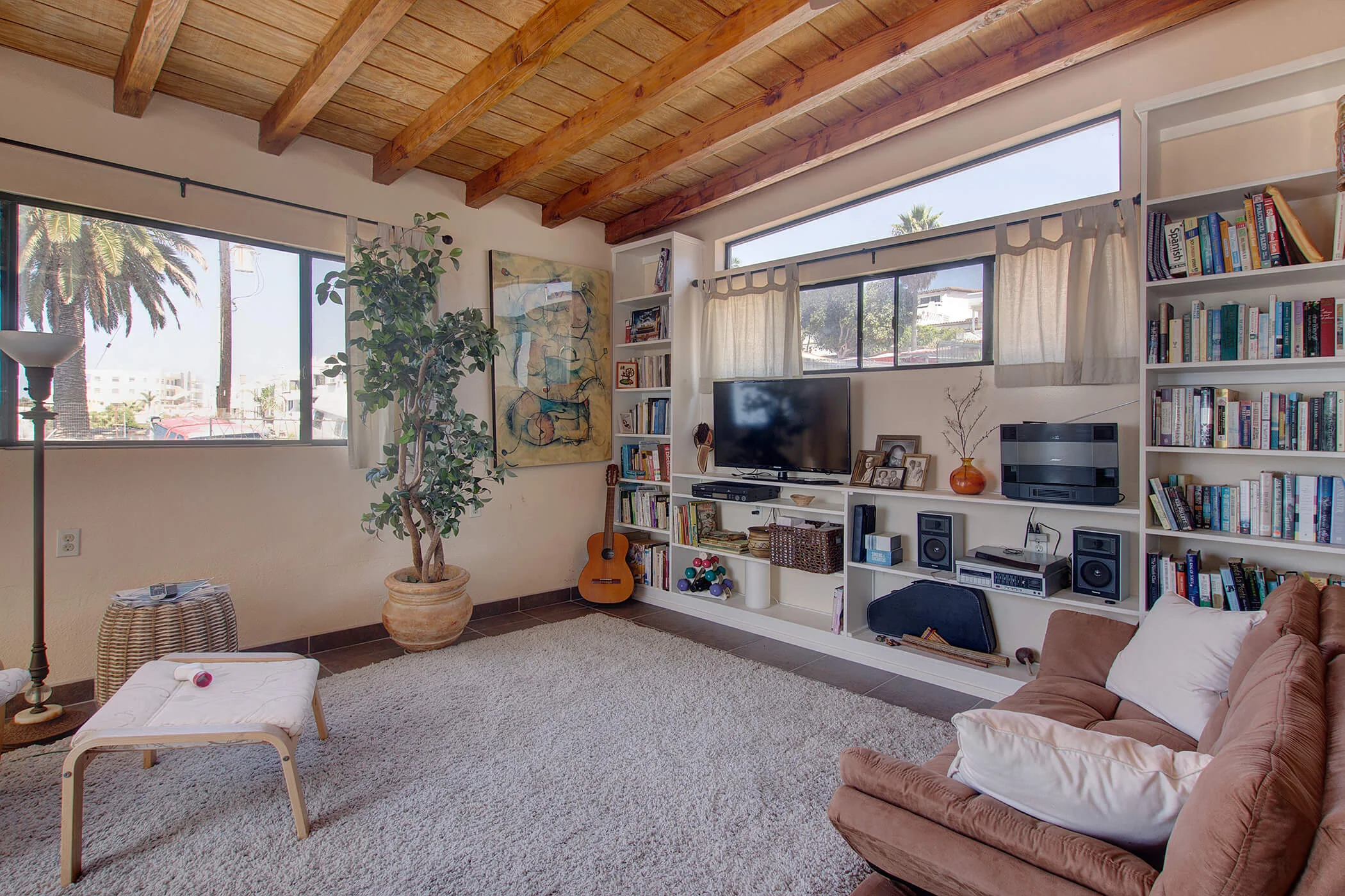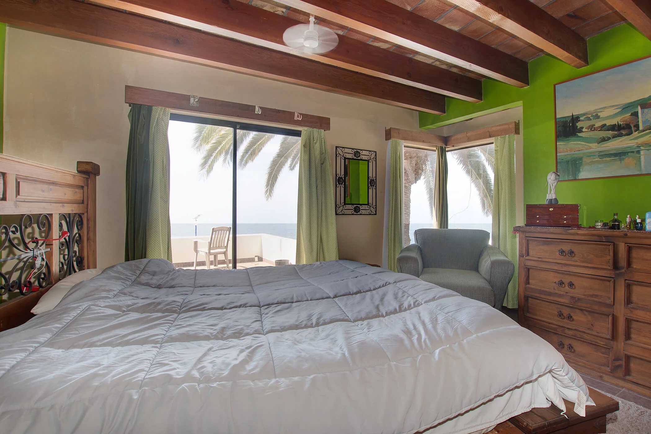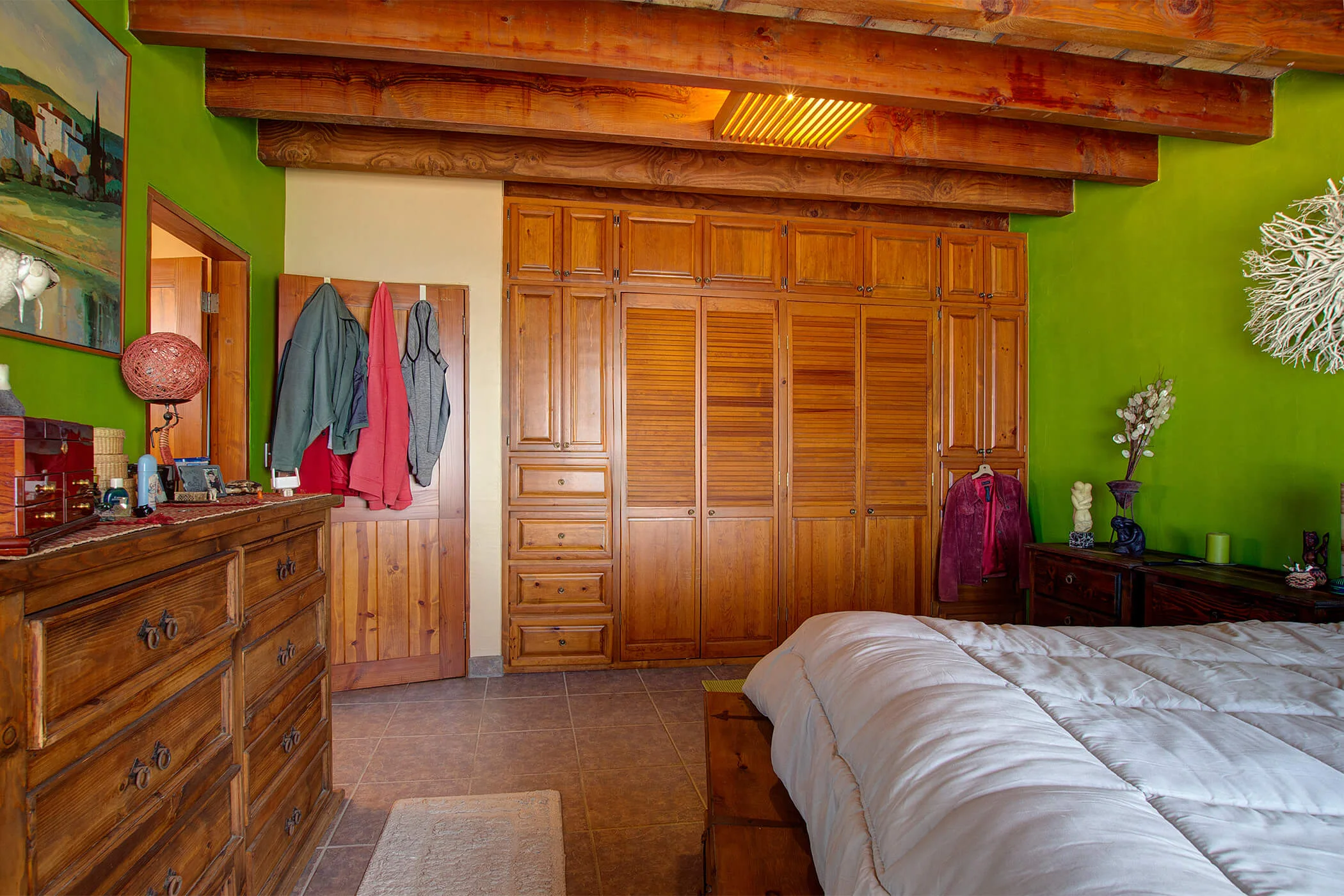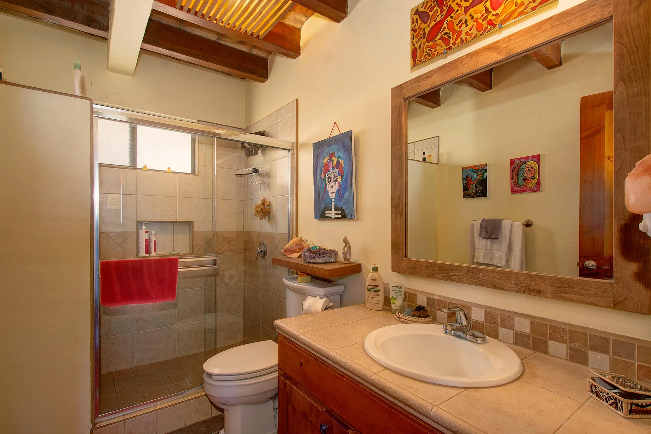 The Mexican charm adorns this house, starting with the ceiling of natural brick between wood 'vigas'. Lovely earth tone tile floors with colorful, contrasting walls adorned with local art and natural wood furniture.