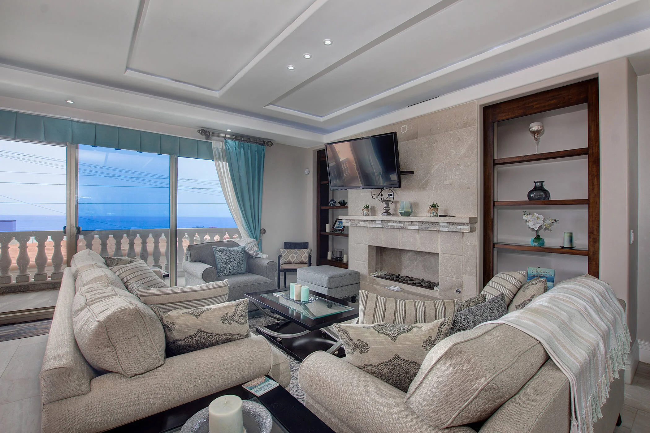- Principal bedroom with ocean view, fireplace, and seating area.