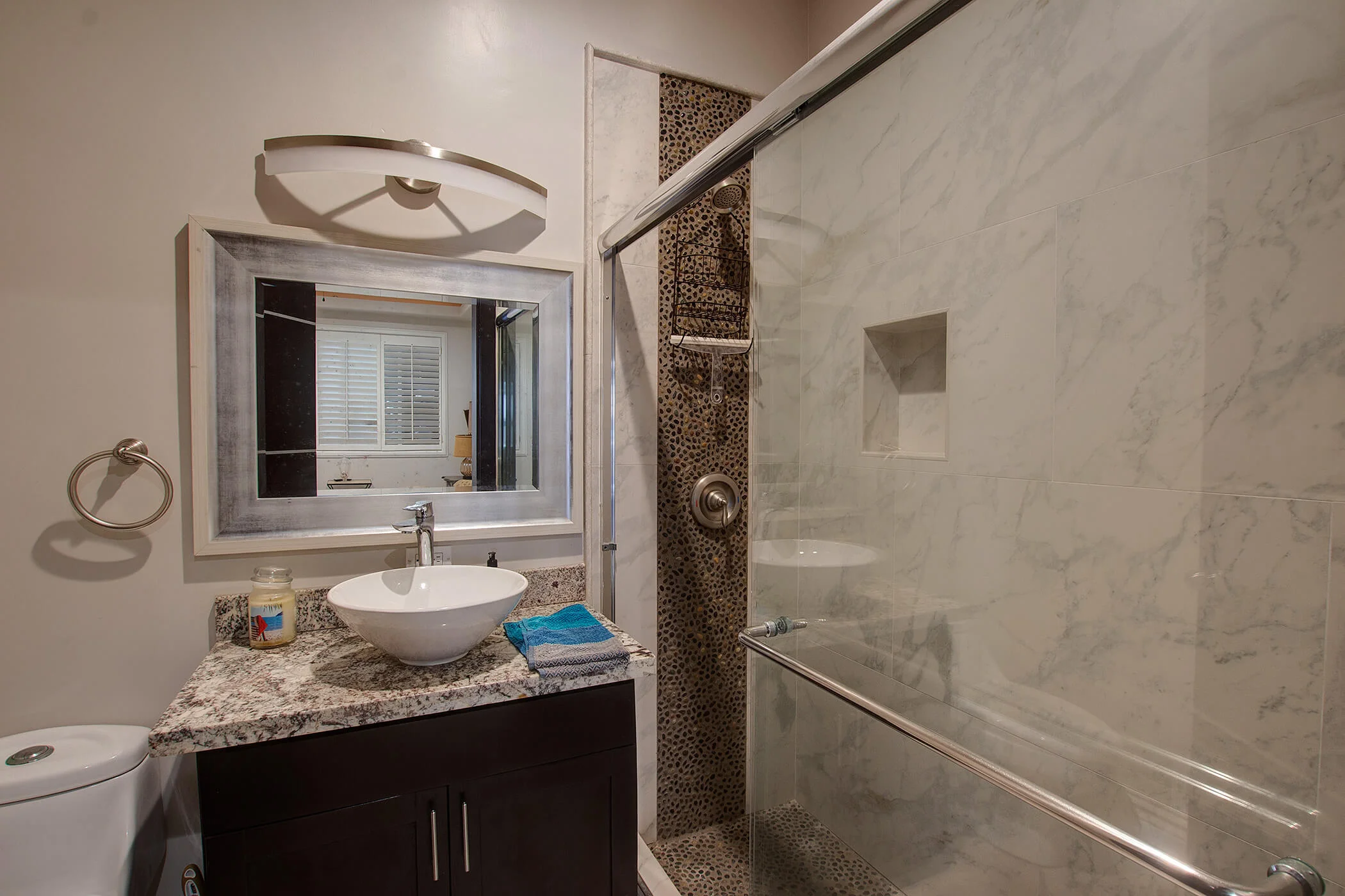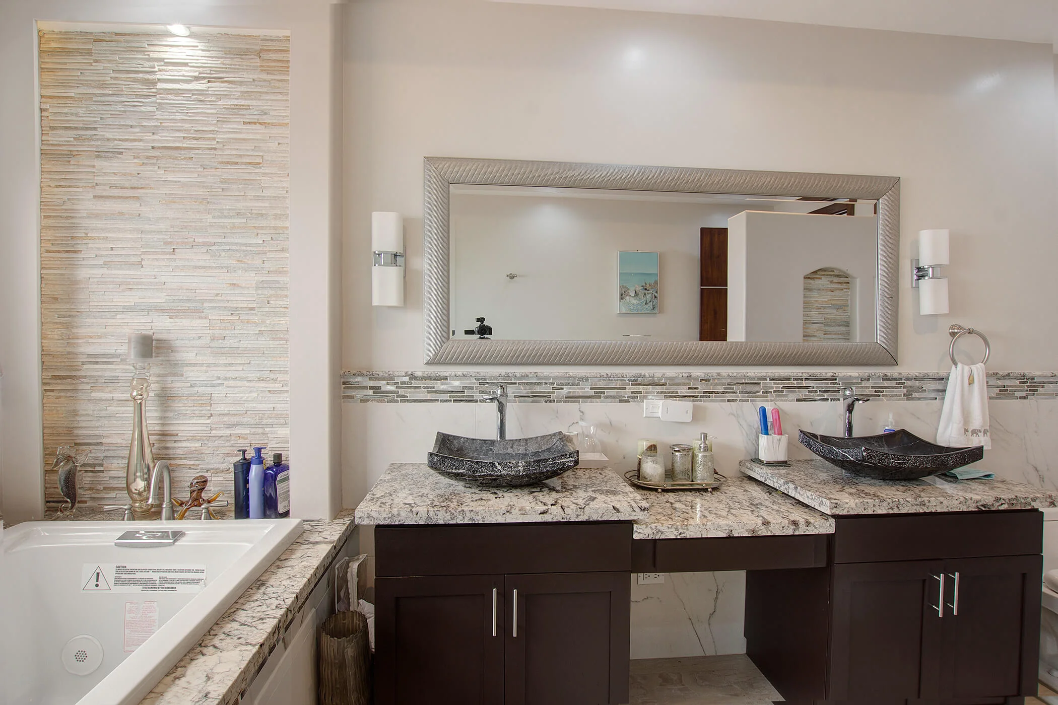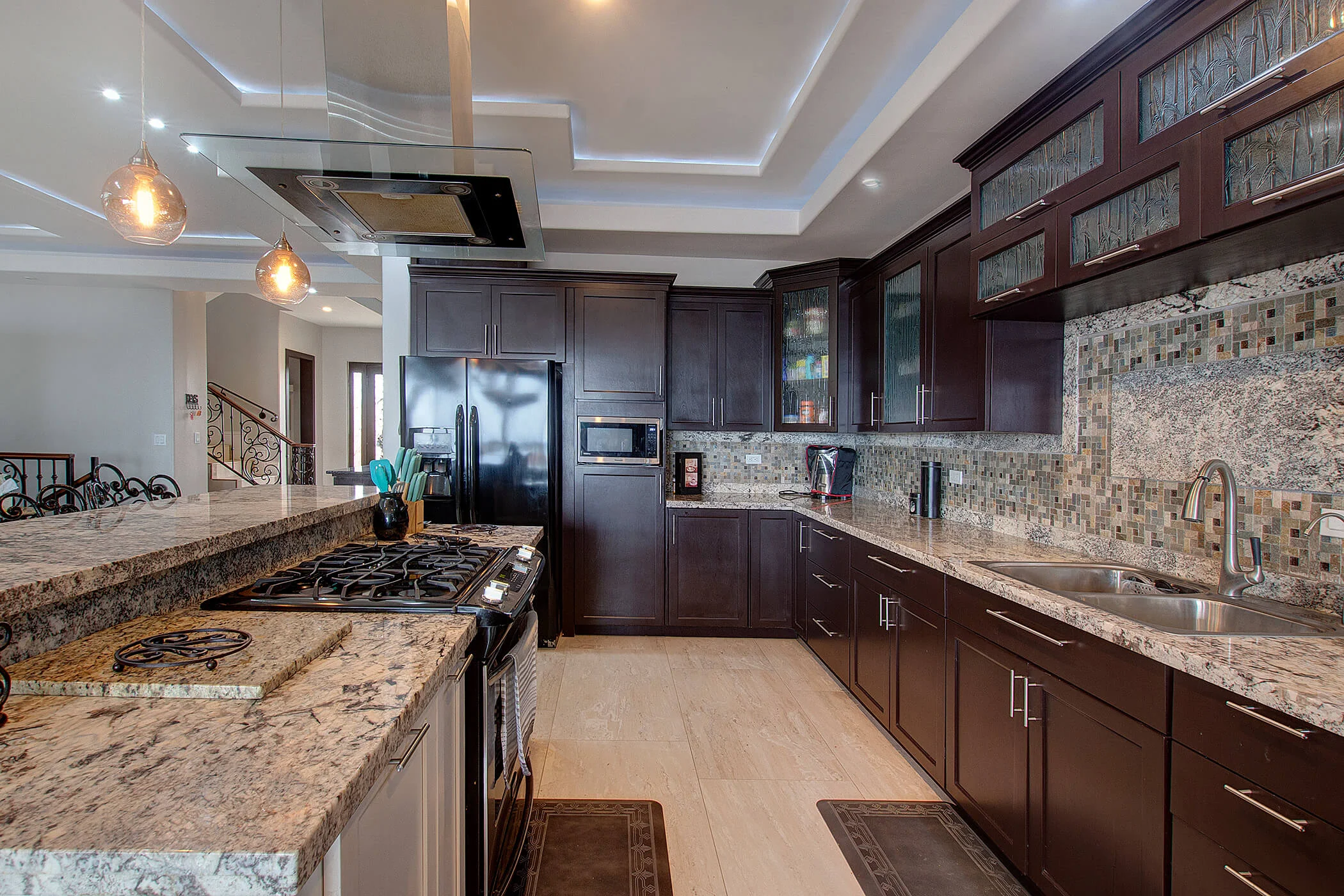 - Three bedrooms with ensuite baths, plus bonus bedroom near garage