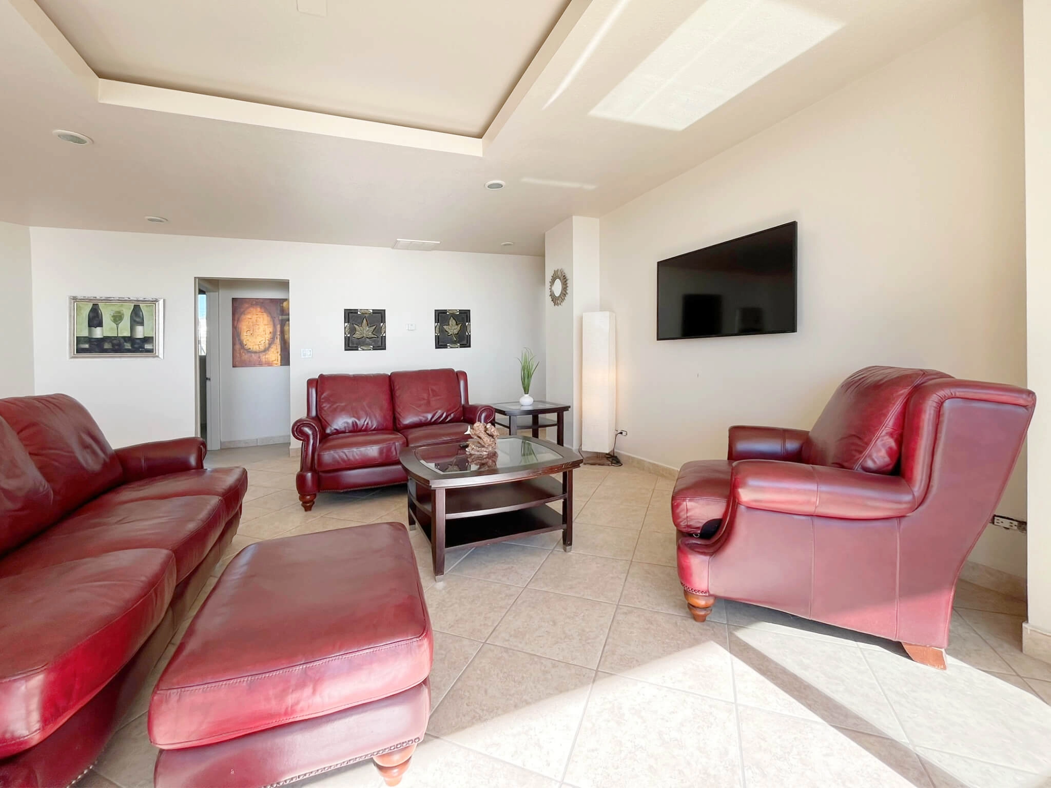 This fully furnished home offers 3 bedrooms and 2 bathrooms, and it’s move-in ready. The open floor plan includes a spacious living room with a large sectional sofa and a flat-screen TV. The primary bedroom also features a flat-screen TV and direct ocean views.