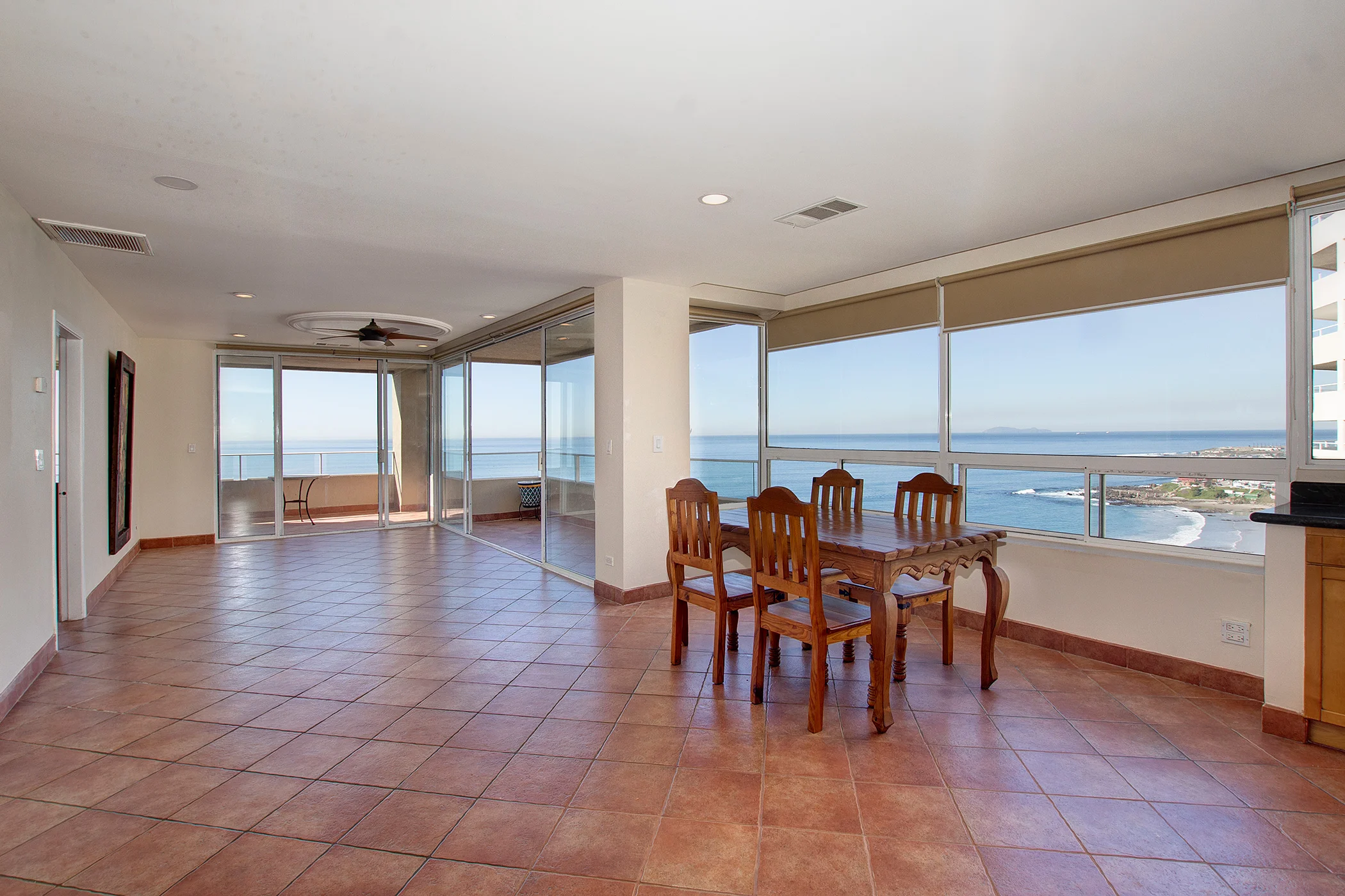 The dining area offers a wide line of windows with expansive ocean views and comfortably seats up to six people.