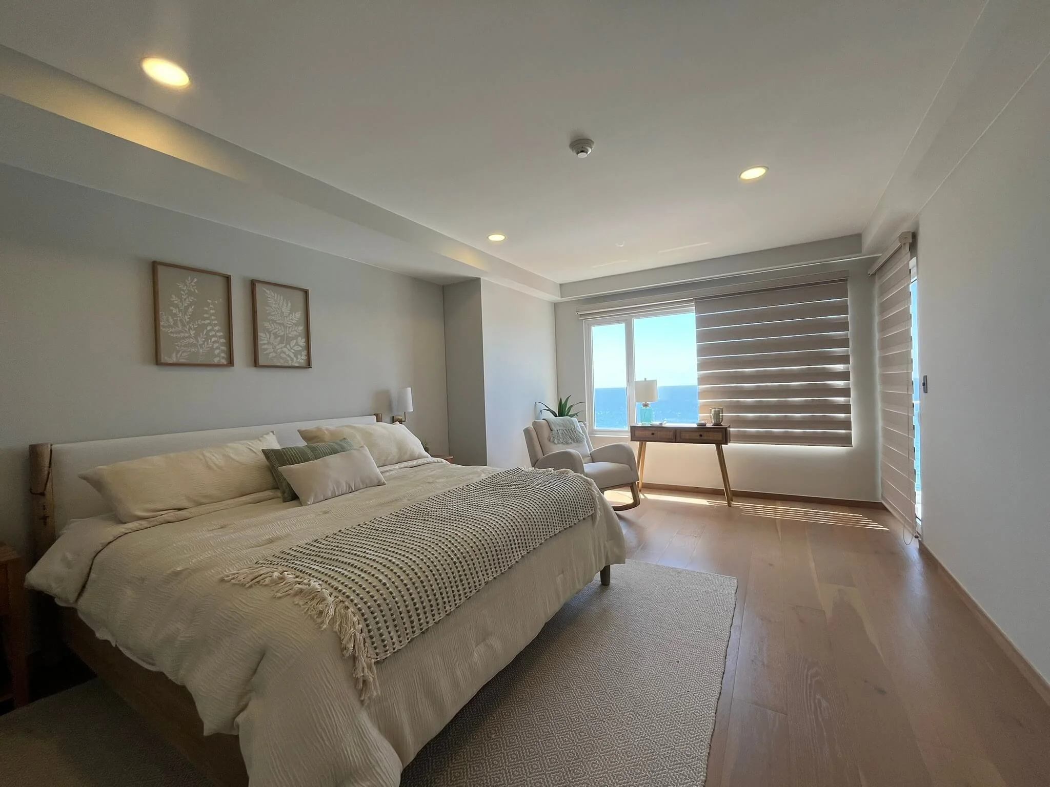 The ocean views can also be enjoyed from the second bedroom’s large window. This bedroom has a private walk-in closet, ensuring comfort and convenience for guests or family members.