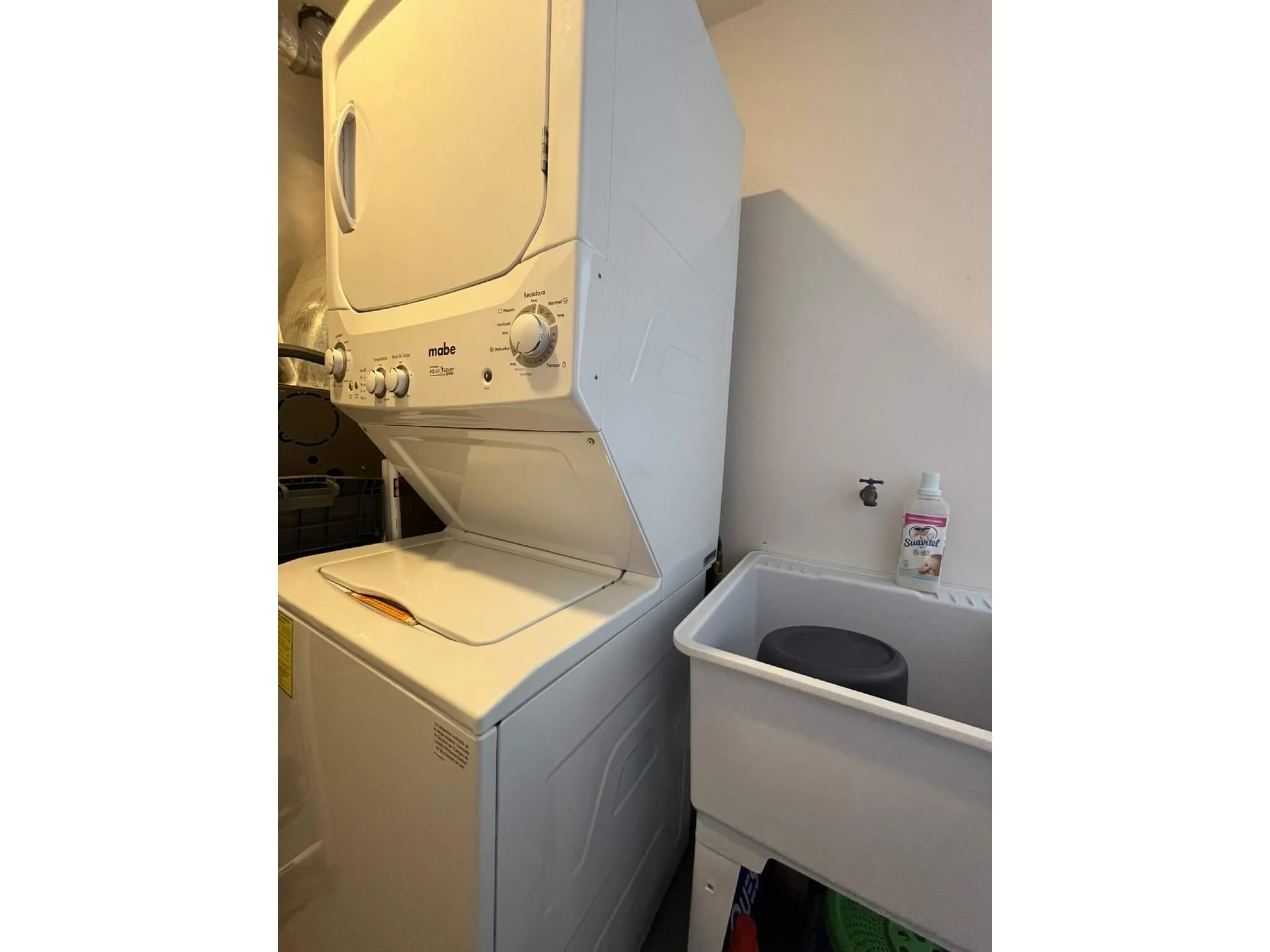 The contemporary kitchen has spacious cabinets and pantry storage. The countertops and backsplash feature a sophisticated quartz known as “calacatta,” complementing the sleek, brand-new stainless steel appliances that make cooking a joy.