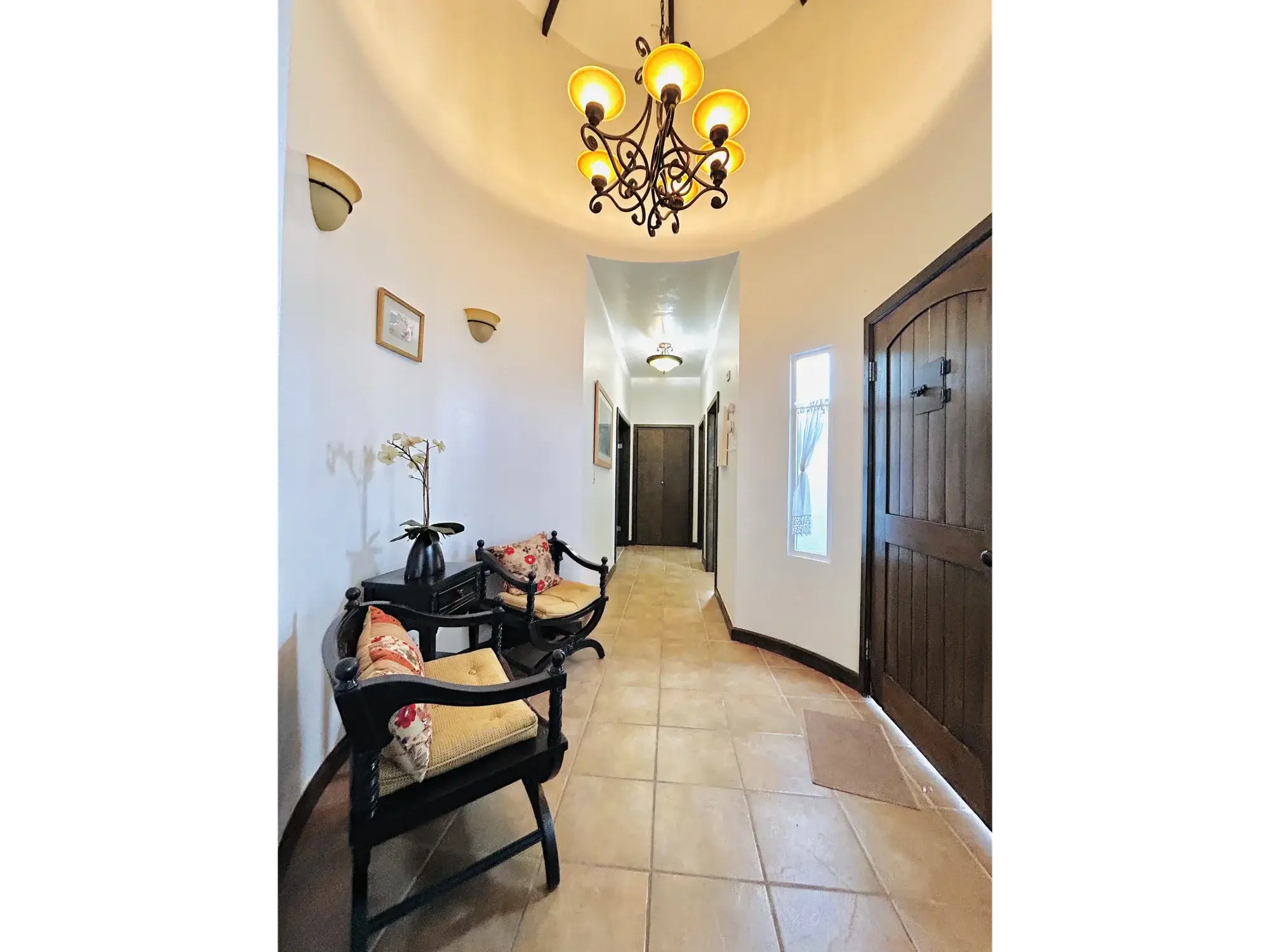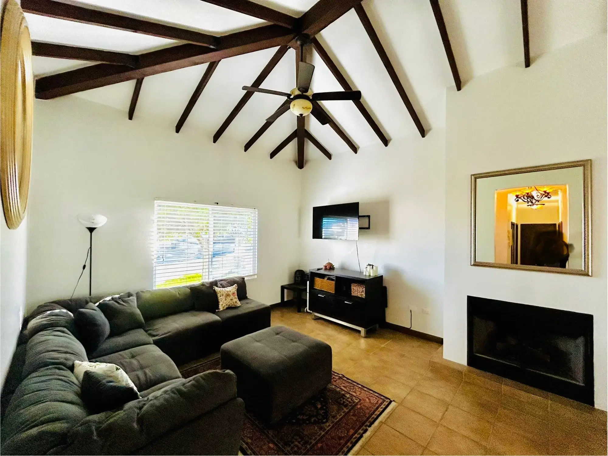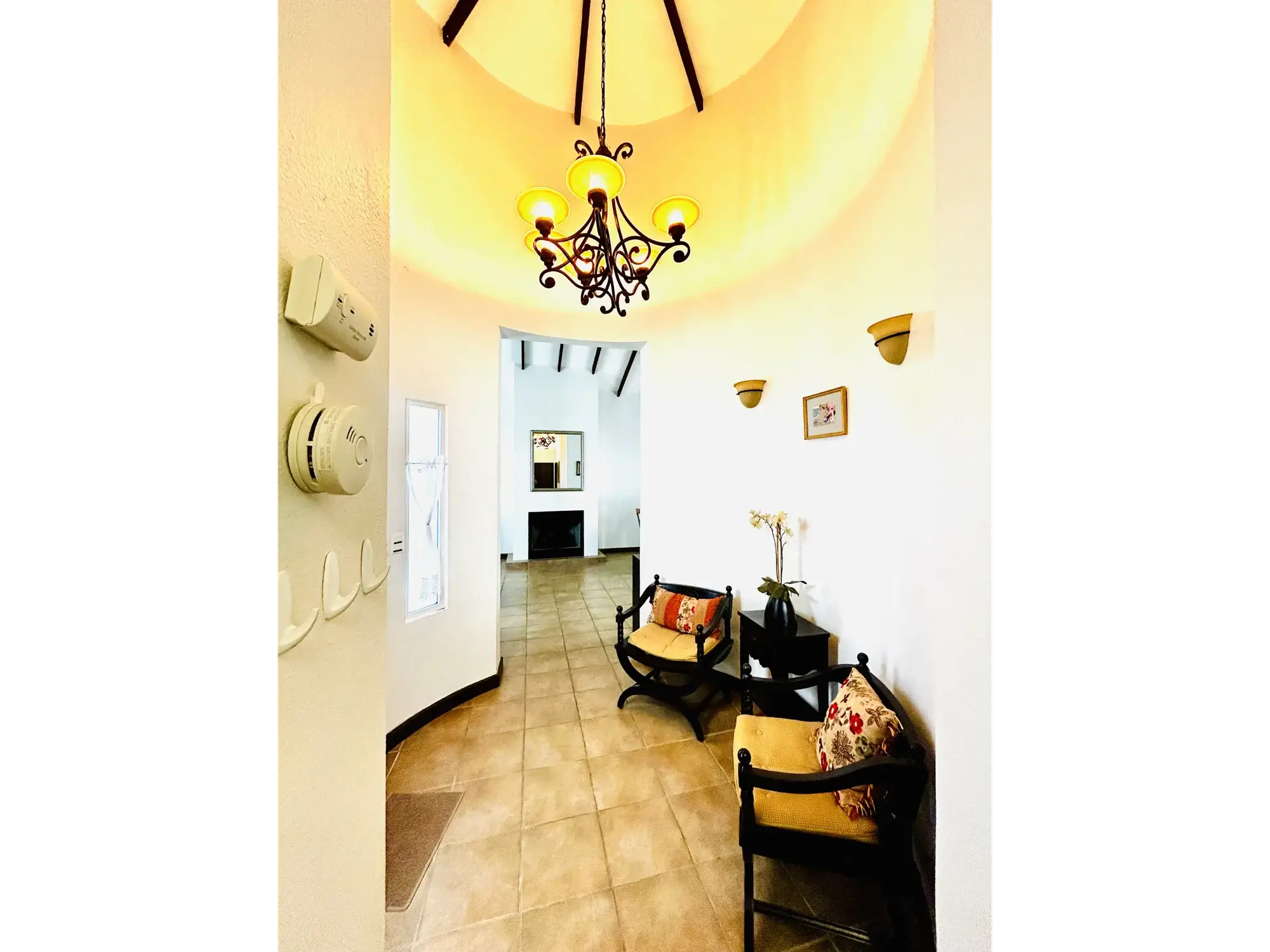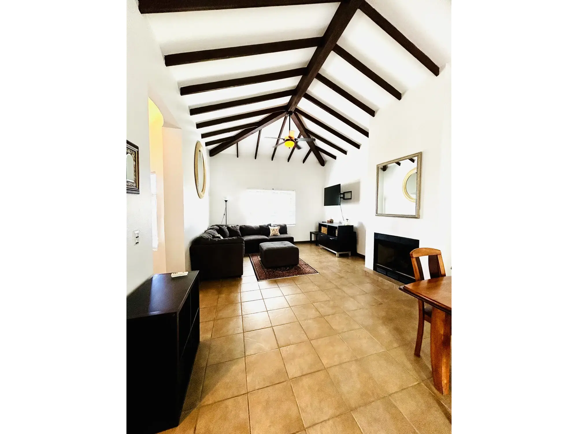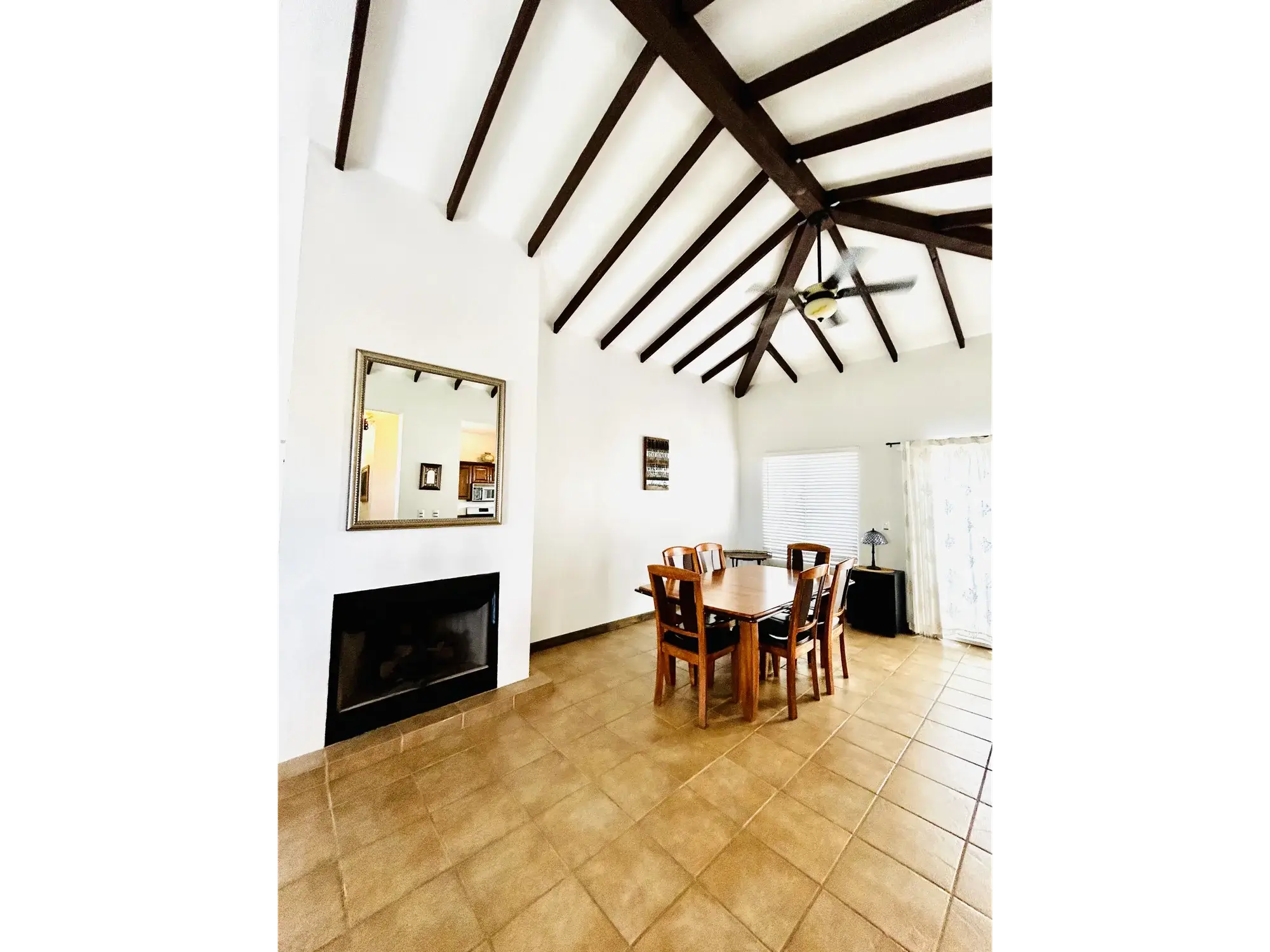 Step inside to a vaulted foyer crowned with a chandelier, offering plenty of space to greet and seat your guests before leading them into the main living areas. The living room features exposed beams, a ceiling fan, and a cozy fireplace, creating a perfect blend of charm and comfort.