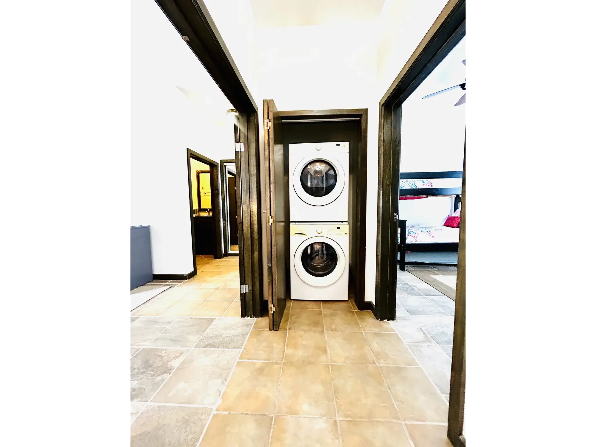 The generously sized kitchen provides ample storage and counter space, making meal preparation both practical and enjoyable. A discreet closet neatly conceals the washer and dryer for added convenience.