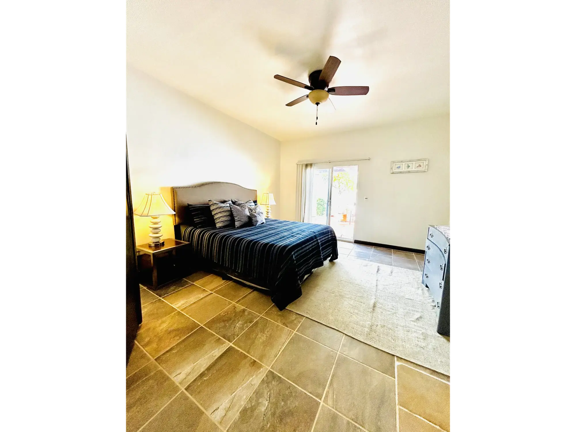 The primary bedroom is bright and spacious, with direct access to the backyard for a private retreat. The secondary bedroom is cleverly designed to sleep up to three, furnished with bunk beds and a single bed.