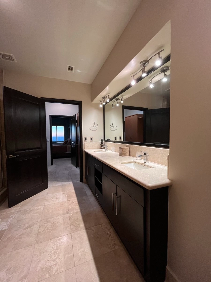 The spacious main bedroom has a huge window and access to the balcony from a glass door. This rooms orientation allows for breathtaking views right from your headboard. The main bedroom has a walk-in closet, double marble sinks in the bathroom, and plenty of space for additional drawers.