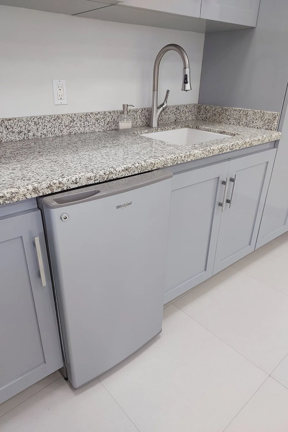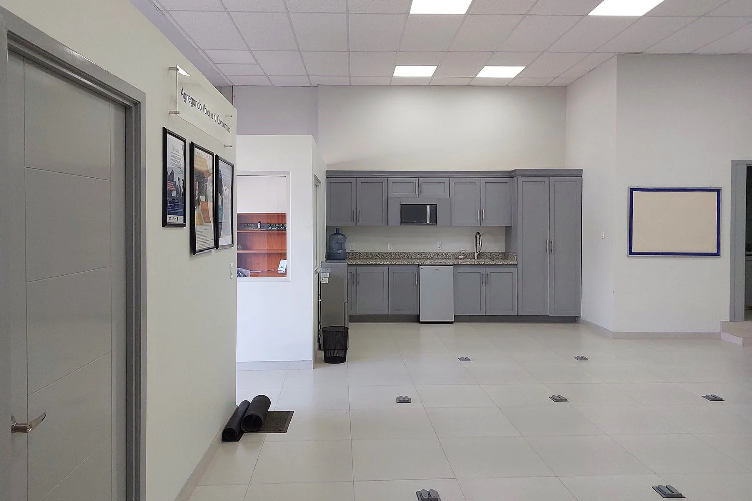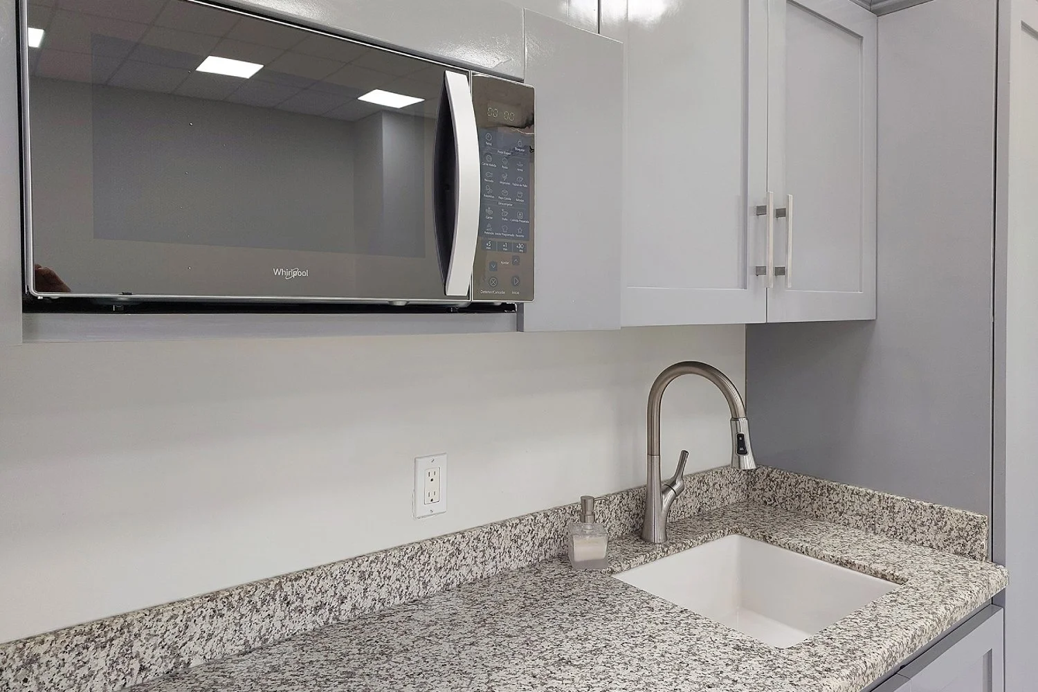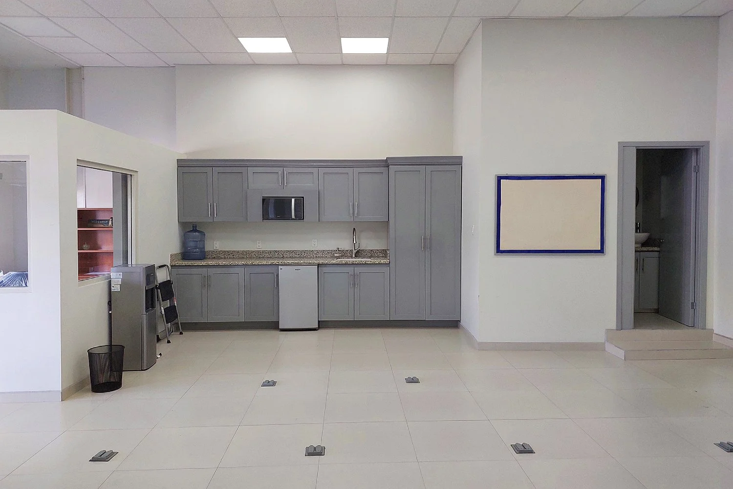 - Kitchenette: A fully equipped kitchenette featuring a serving counter, sink, cabinets, microwave, and water cooler. All serving items, such as plates, cups, and glasses, are provided, making it easy to cater to employees or guests.